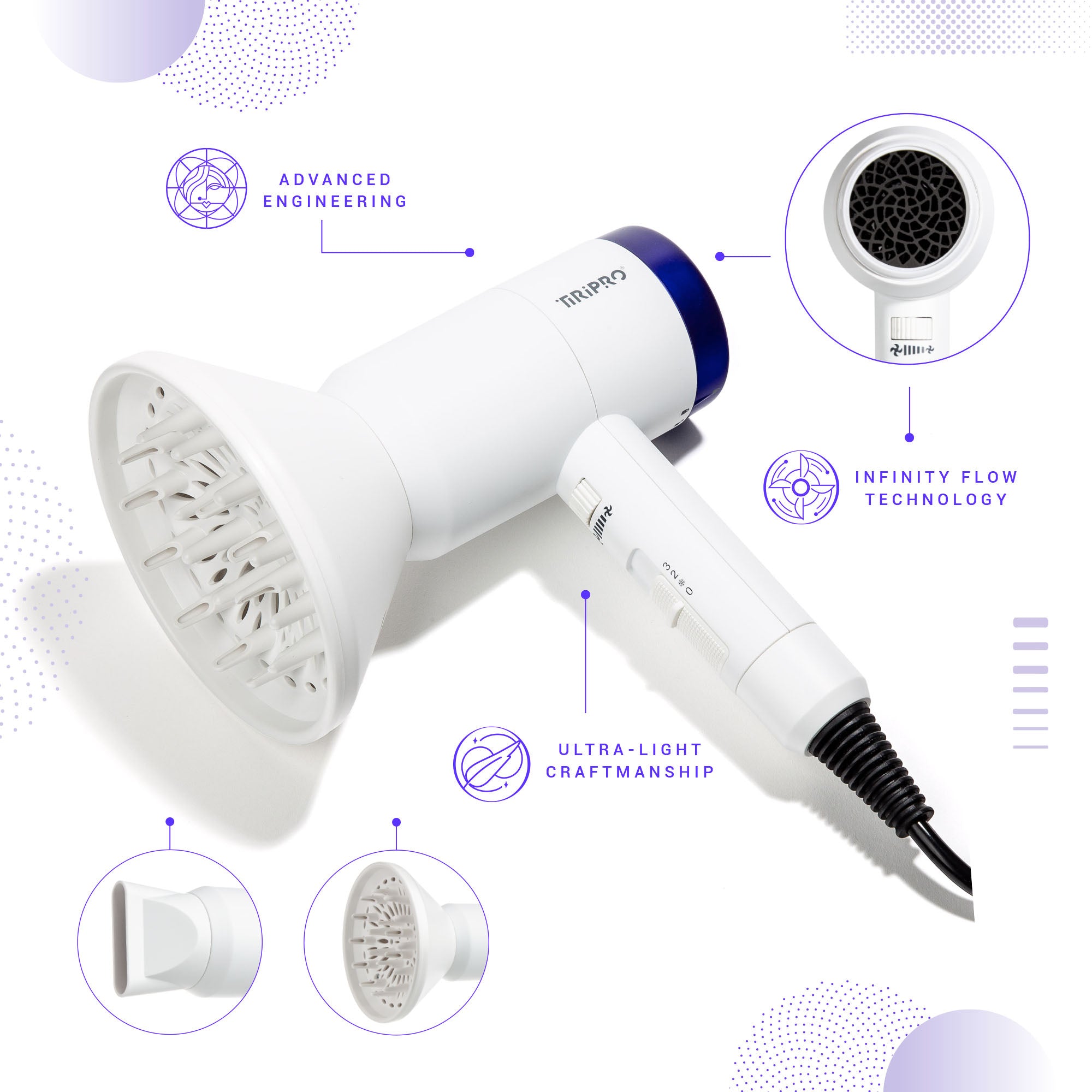 SnapFit Concentrator Nozzle for a refined finish and Diffuser Attachment to enhance curls and reduce frizz